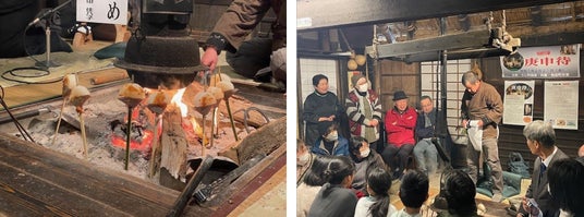 また上映会後には、囲炉裏で焼いた地元の田楽餅やぼた餅、豚汁などが振る舞われました。その後、今や見かけなくなった「ふんどし」の試着や「蟹のふんどしクイズ」などが行われ、昔から山奥に伝わる海との関わりを再認識しました。