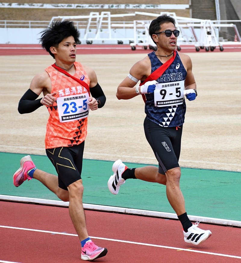 2位でタスキを受けた鳥取県西部消防Aチームのアンカー細田大智さん(33)が、後半にスパートをかけて出雲市消防本部の職員を抜き去り、32分48秒でゴールした。前回大会は業務のため出場できず、優勝を逃していた。「応援もあったので優勝する気持ちで走り抜いた」とすがすがしい表情だった。