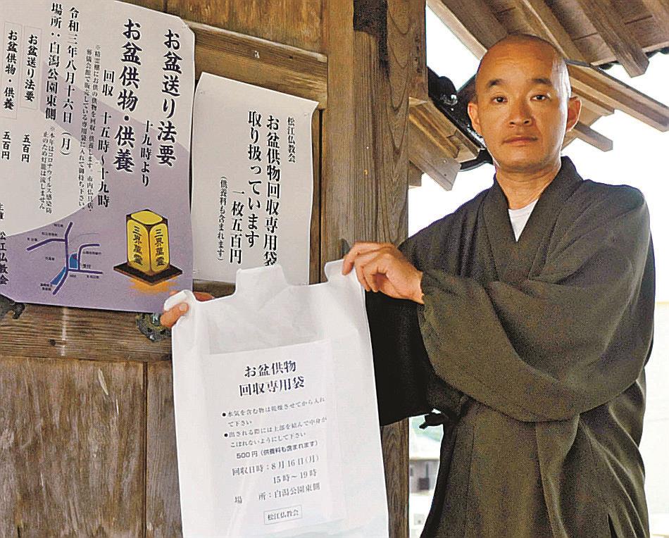 特別回収は松江市魚町の白潟公園で実施。16日午後3~7時の間、持ち込みを受け入れ、直後に仏教会の僧侶が般若心経を唱え、供養する。回収には専用の回収袋が必要。市内の葬儀社や仏具店6事業者と一部寺院で、500円で販売する。袋代は回収と供養の経費に充てる。新型コロナウイルス感染拡大「第5波」で、里帰りが少ないと予想される中、西尾さんらは、寂しい思いをする人が増えると推察。「少しでも心情に寄り添いたい」と話す。問い合わせは、龍雲寺、電話0852(21)9789。