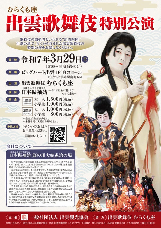 歌舞伎の創始者といわれる“出雲阿国”生誕の地である出雲において、古くから育まれた出雲歌舞伎。「むらくも座」は、戦後途絶えていた出雲歌舞伎を復活させ、毎年のように定期公演を行っています。特徴的なのは、誰もがわかりやすい演目を取り上げている点です。今年の春には、よく知られた神話である須佐之男尊(すさのおのみこと)のヤマタノヲロチ退治を題材にした特別公演が開催されます。出雲の伝統芸能をぜひお楽しみください。