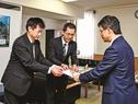 松江市殿町の島根県警本部で贈呈式があり、山陰中央新報社の宇畑学取締役ビジネスプロデュース局長と山陰中央テレビジョン放送の森山達也取締役地域創造ビジネス本部長事業プロデュース局長が県防犯連合会顧問の丸山直紀県警本部長に目録と回転灯を手渡した。
