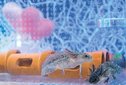展示されているのは素早く動き回る体が白い魚や、雄が卵を守る魚など6種類。体長約10センチのゴールドスペックジョーフィッシュは、フィリピンなどに生息する。海の砂底に巣穴を掘り、卵がかえるまで口の中で保護する。