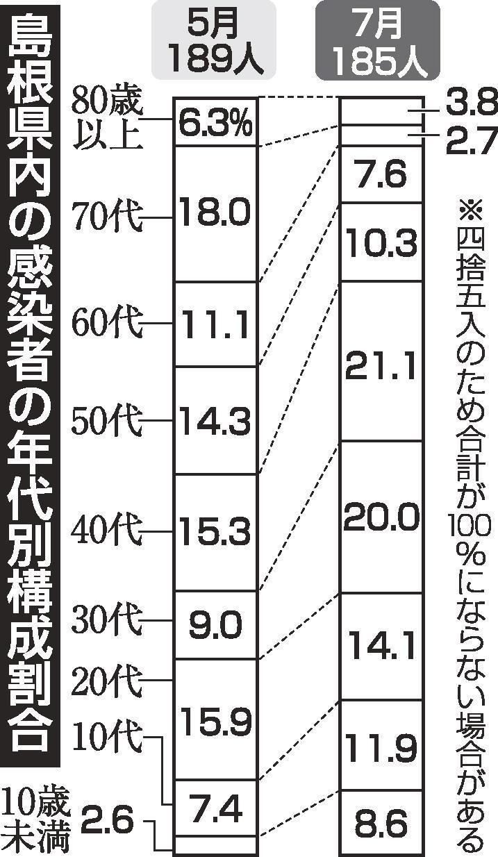 高齢者接種が本格的に始まった5月と、軌道に乗った7月で、島根県内の感染者の年代別構成割合を比べると、高齢の世代が占める割合は減った。特に70代は5月に18・0%を占めたのが、7月は15・3ポイント減の2・7%。県感染症対策室の田原研司室長は「高齢者を守るという目標はほぼクリアできた」と話す。