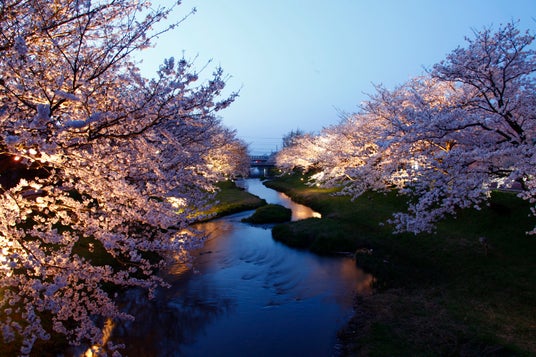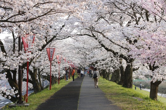 「日本さくら名所100選」に選ばれた斐伊川堤防桜並木は、約2kmに渡り、約800本のソメイヨシノが咲き誇ります。見ごろの時期には屋台が並び、ライトアップやぼんぼりで夜桜に風情を添えます。