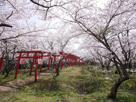 約500本のソメイヨシノやヤエザクラが咲き誇ります。例年4月上旬に満開を迎え、赤い鳥居と桜の美しい光景が印象的です。