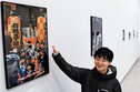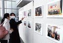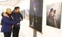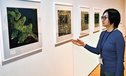 松江市玉湯町玉造の出雲玉作資料館で恩田明弘さん(62)=同町湯町=の初の写真展が開かれ、宍道湖から望む色鮮やかな夕日の写真に来場者が見入っている。30日まで。