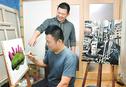 油彩、パステルの抽象画を並べた現代美術家協会会員の本池邦全さん(74)=本名・和三(か...