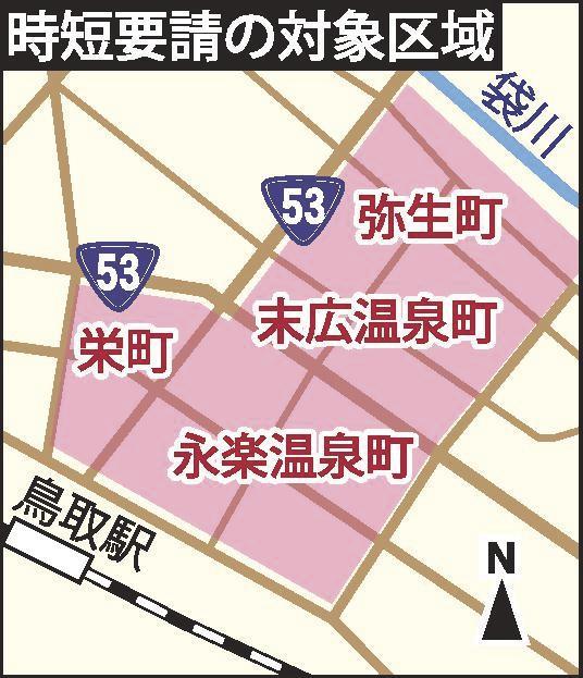 鳥取市の対象区域は弥生町の全域に加え、末広温泉町、永楽温泉町、栄町のそれぞれ一部。区域内にはクラスターが発生した3店舗が入居するビルがあるほか、複数の飲食店で感染者が確認された。