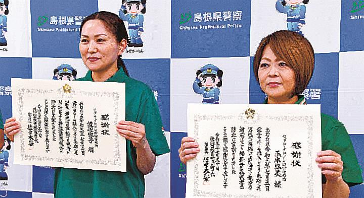 浜田市黒川町の浜田署であった贈呈式で、佐々木肇署長から感謝状を受け取った玉木さんは「市内にはお年寄りも多いので気をつけ、声は掛けていきたい」と話し、渡辺さんは「ささいなことに気づき、行動に移して良かった」と笑顔を見せた。 (陶山貴史)