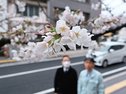 江津市敬川町の敬川沿いの桜が見頃を迎えた。開花に合...