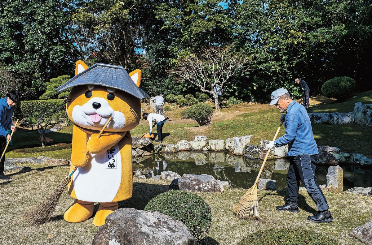 修行中との設定になっている万福寺で清掃活動に初参加した。雪舟が作庭したとされる国史跡・名勝の庭園で、落ち葉を集めたり、雑草を取り除いたりするメンバーに交じり、ほうきで庭を掃いた。篠原亨会長(77)は「かわいらしい。良いPRになる」と期待した。
