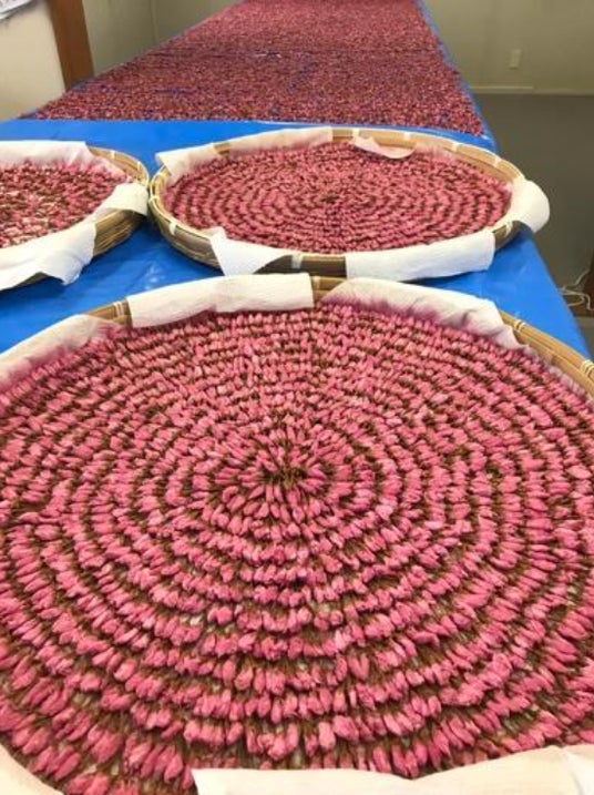 木の花工房は、さくら染めの工房として立ち上げられた後、「桜の塩漬け」も作るようになりました。丁寧な手仕事で漬ける独自の「桜の塩漬け」は色鮮やかで美味しく、桜の花一輪一輪形を整え綺麗に並べて干す作業場の美しさは、季節の風物詩として毎年新聞にも取り上げられてきました。しかし、高齢化により2023年度に塩漬け工場を閉めることになりました。