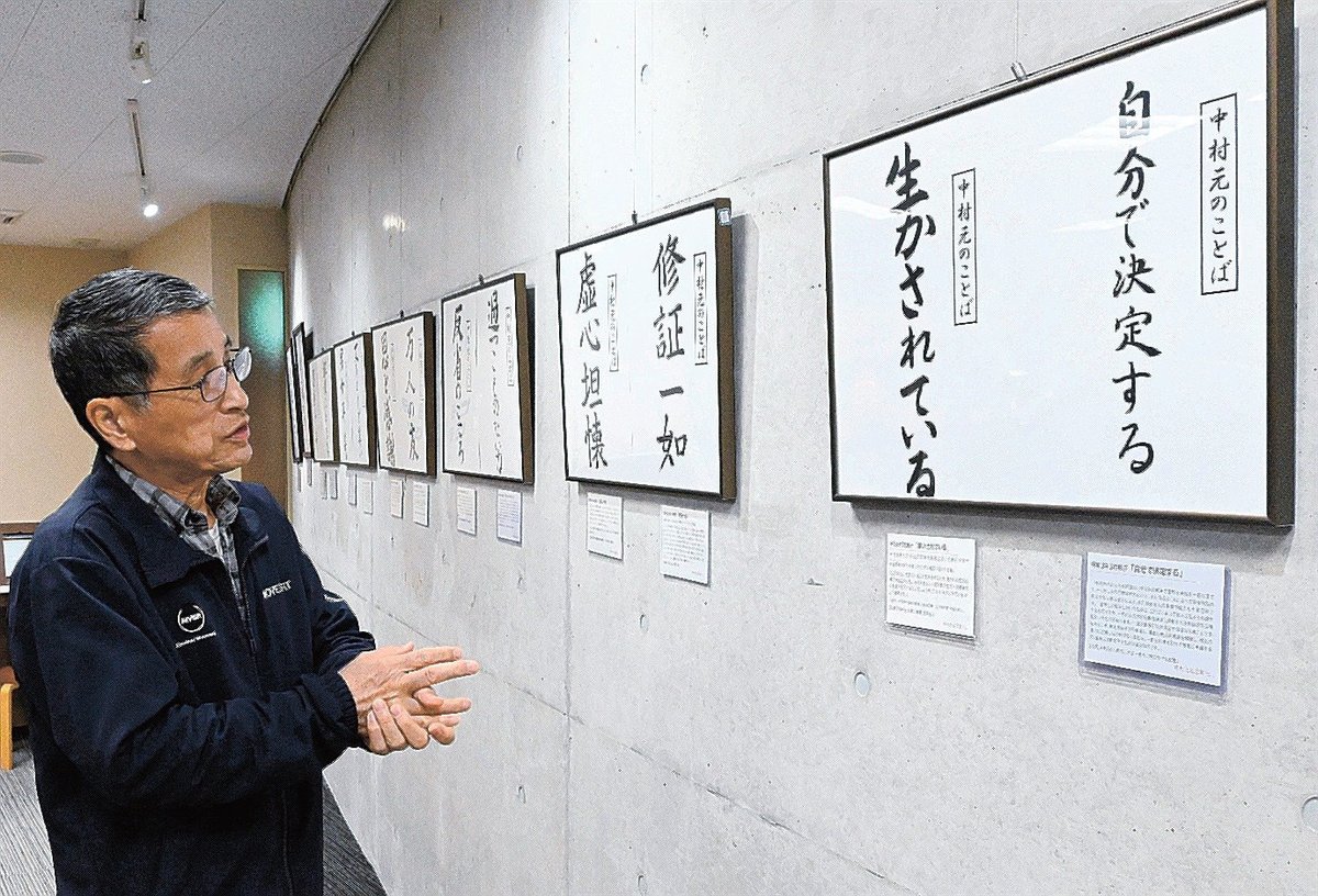 同館では2020年から八束公民館で活動する「中央書道サークル」と協力し、掲示板で毎月、中村博士の言葉を紹介してきた。中学校から晩年にかけての作文や書籍から書道サークルの会員が書いた言葉や資料など約100点を並べる。