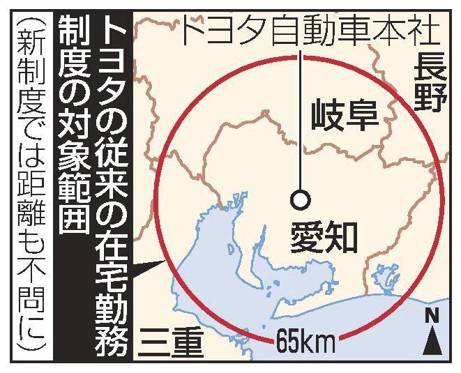 新制度は1日に始めた。これまでは職場から自宅までの距離が65キロ超の場合は通勤に補助はなく、この範囲外での在宅勤務は難しかった。愛知県豊田市のトヨタ本社で勤務している場合、東海3県と長野県、静岡県の一部が65キロ圏内に該当する。