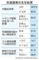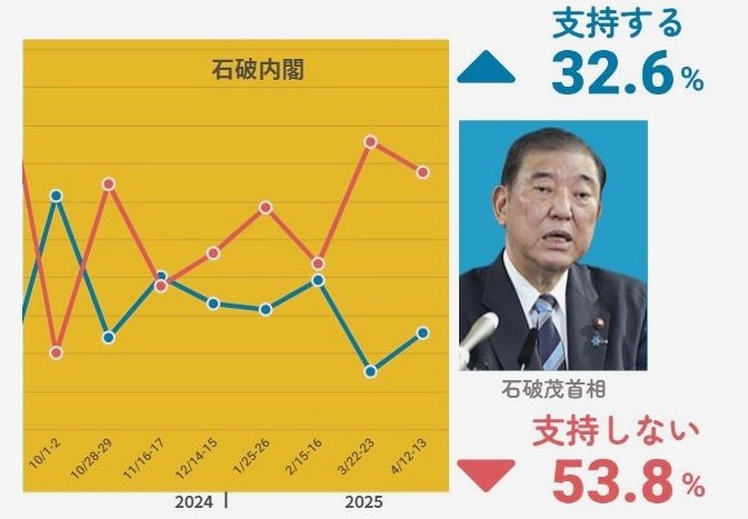 共同通信社が4月12日、13日に実施した全国電話世論調査で、石破内閣の支持率は32.6%となりました。発足後で最も低かった前回調査(3月22日、23日)から5.0ポイント上昇しました。不支持率は前回より4.0ポイント下がり、53.8%でした。