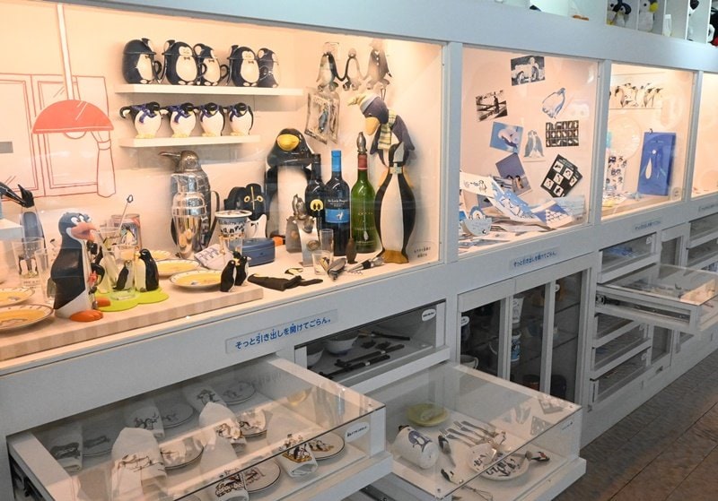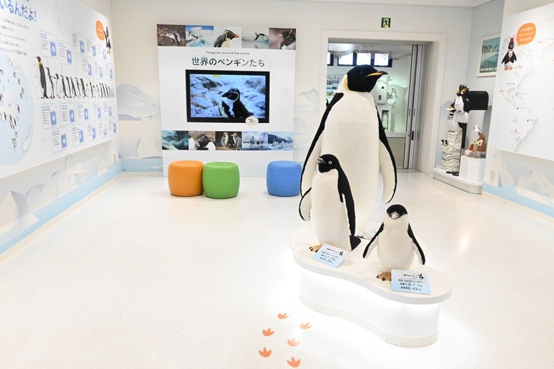 ペンギンの生態が学べるパネルやビデオはもちろん、ペンギングッズもある。ペンギンのキャラクター「ピングー」の人形や、ペンギンの食器や写真集、絵本なども飾られている。