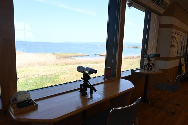 野鳥観察舎は2019年にリニューアル。バードウオッチング用の望遠鏡が常設され、年間100~150種類の鳥を観察できる。スタッフが常駐し、使い方やどんな鳥がいるかも教えてもらえる。春はミサゴ、秋は「冬の使者」と呼ばれるコハクチョウ、冬は巨大なオオハクチョウが観察のお目当てになる。