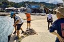 コースは日御碕コミュニティセンター近くをスタートし、山道や出雲日御碕灯台付近の遊歩道を通って地区内を回り、旧日御碕小学校を目指す約10キロ。宇龍港では、海中からコンクリートブロックを付けたロープを引き上げる「ミッション」もあり、参加者たちは住民の声援を受けて力を振り絞った。