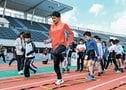 浜田市陸上競技協会(山崎晃会長)が主催する石見陸上競技大会が26日、同市黒川町の市陸上競技場であった。100回目を記念し、中国電力陸上競技部で活躍した選手2人がゲストランナーで参加。小学生以上の出場者約300人が一流の走りを学びながら健脚を競った。