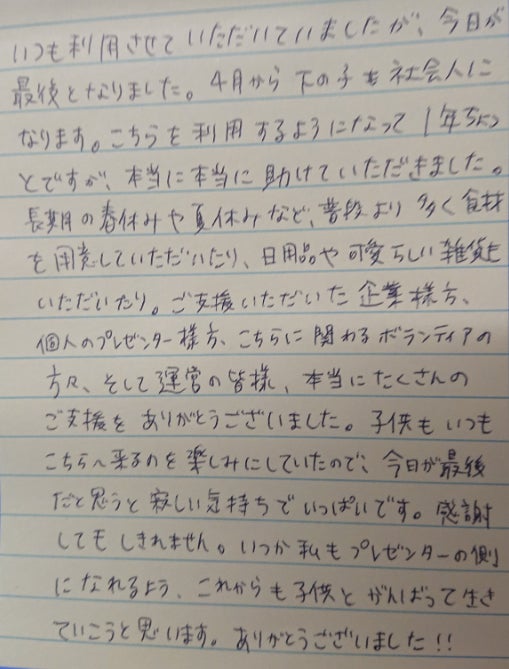 今回ありがたくも目標金額を上回るご寄付をいただけましたが、まだまだ厳しい運営状況であることには違いありません。実際、春休みキャンペーン以降お米は1世帯あたり1kgお配りしていたところ、苦渋の末、数日前から3合(450g)に減らすことにいたしました。引き続き「子どもたちに1日3回の食事を!」を旨に活動して参ります。改めてご支援(とくにマンスリー会員)いただければ幸いに存じます。