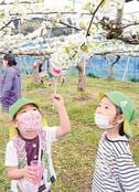 このうち、わたりはし保育園の年長クラス24人は、だんだん梨屋あぐ梨(り)の12アールの梨園を訪れた。自家採取した花粉をふわふわのぼんてんに付け、手を伸ばして、めしべに当てた。