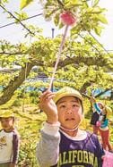 8月には収穫も体験する。花粉付けをした高野幸咲ちゃん(5)は「おいしくて、大きい梨ができるといいな」と収穫を心待ちにしていた。(今井菜月)