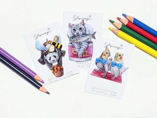 yasuragi/色鉛筆で描いた動物のアクセサリー。リアルながらも温かみのあるタッチで愛着が湧きます。