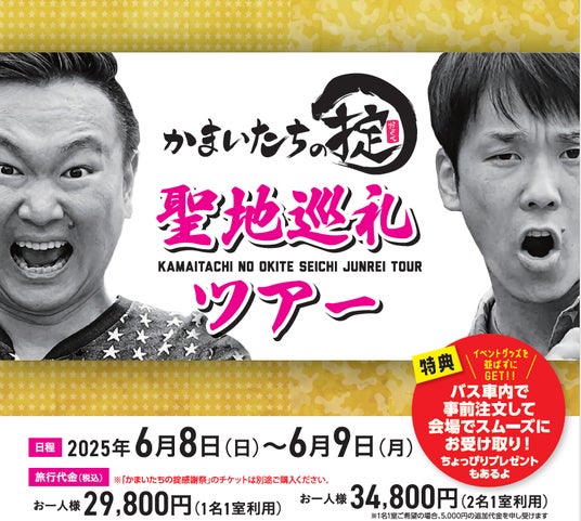 TSKさんいん中央テレビ(本社:島根県松江市)は、同社で放送中の人気番組「かまいたちの掟」のファン感謝祭にあわせて、番組ゆかりの地を巡る1泊2日の特別バスツアー「かまいたちの掟 聖地巡礼ツアー2025」を6/8(日)6/9(月)の2日間開催いたします。