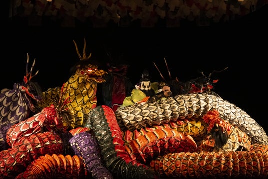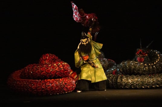 高天原を追放された須佐之男命は出雲国斐伊川の悲しき物語を聞き、大蛇に悩まされる人々を救うため自ら大蛇に立ち向かう。須佐之男命の勇壮な立ち回りや大蛇の迫力ある激しい芸に目が離せない石見神楽人気No.1の演目。