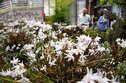 島根県隠岐の島町犬来の民家でラン科植物のセッコクが満開になった。町内にある火山性の岩石によく根を張るといい、独自の栽培方法で花を咲かせた100株以上のセッコクが純白や淡いピンクの花を咲かせている。