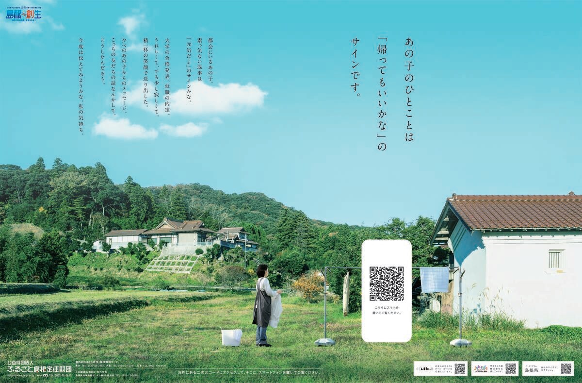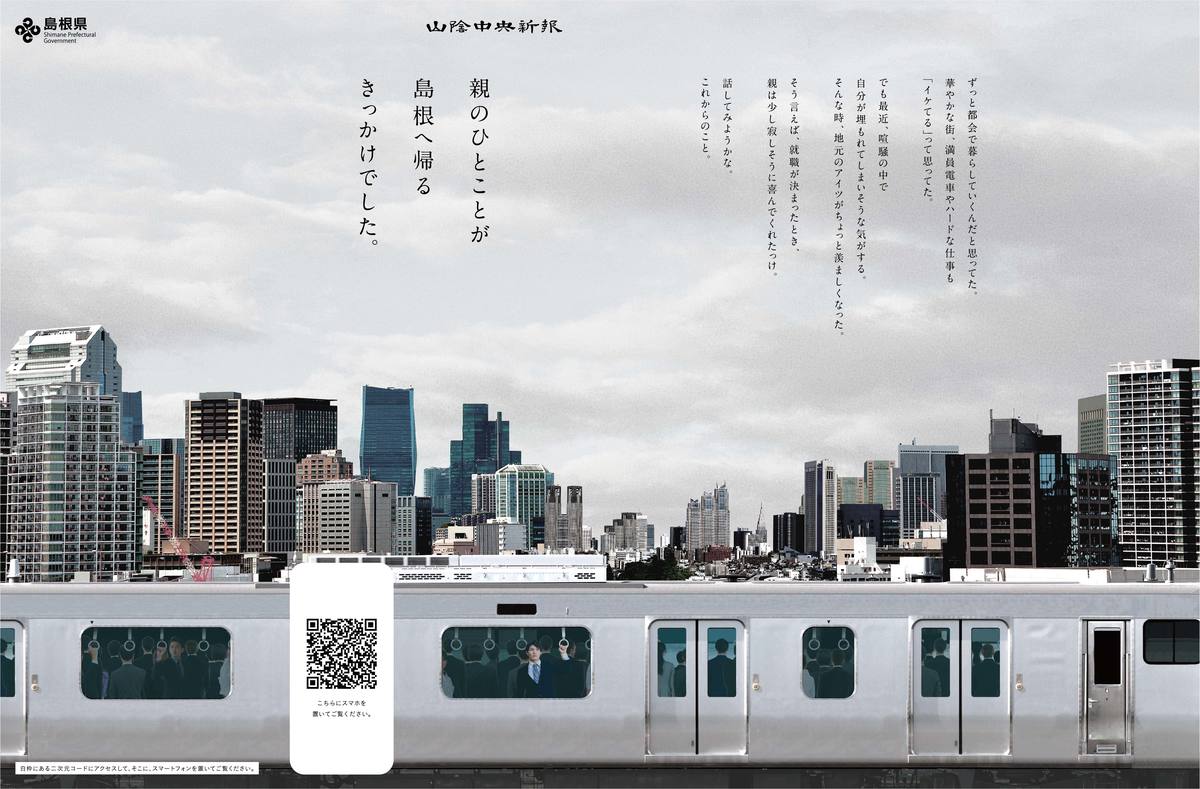 コロナ禍で地方回帰の流れが進む中、親から子どもへUターンを呼び掛けてもらうのが狙い。広告は、表面が都会で忙しい日々を送る県出身の20代の男性、裏面が島根で子どもを想う親の様子を掲載。ちょっとした一言がきっかけで、離れて暮らす親子のお互いの気持ちが伝わった時、何を思うのか。紙面上にある二次元コードをスマートフォンで読み取って置くと、紙面と連動し、親と子のショートストーリーが流れる仕掛けになっている。