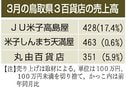 鳥取3百貨店 売上高横ばい 4月 山陰 2025/5/28 04:00 保存 中国四国百貨店協会がまとめた4月の鳥取県内3店の売上高は、前年同月比横ばいの9億... 残り373文字(全文:414文字) 続きを読むには会員登録が必要です 無料会員に登録する ログインする 保存 記事を保存する この機能は有料会員限定です。保存した記事やフォローした特集をマイページでご覧いただけます。 有料会員になる ログイン 関連記事 鳥取3百貨店 7.3%増12.5億円 3月売上高 2025/4/29 04:00 鳥取3百貨店の売上高6.5%減 2月 2025/3/27 04:00 鳥取3百貨店の売上高7.3%増 1月 2025/2/27 04:00 鳥取3百貨店 売上高3.3%増 12月、13億7千200万円 2025/1/28 04:00 邪馬台国、淀江にあった!? 根拠解説の冊子が話題に 2025/11/22 15:12 特集・連載 島根大お笑いサークル「あちゃらか」から2組がM-1初戦突破 狭き門、2回戦は敗退も手応え 2025/11/12 04:00 献血推進大使に大学生4人任命 島根県血液センター 2025/9/1 04:00 紫紺の誓い 選抜高校野球米子松蔭(下)自主性 判断力が勝敗分ける 指示待たず動く選手 2025/3/13 04:00 住民、竹島問題啓発を要望 5年ぶり、領土議連と意見交換 2025/2/22 04:00 【期間限定】島根スサノオマジック「選手のサイン入りTシャツ」プレゼント! やっぱり、しまねがいい。Uターンして気づいた暮らしの豊かさ。浜田市にUターンした渕上さんの話。 山陰中央新報社 秋の大プレゼント! スサノオマジック「フェイスタトゥーシール」販売決定!