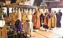 小中学生が参加する深野神楽こども教室は、5人の神が天下泰平を祈る「五行」を演じた。子どもたちは体全身を目いっぱいに使って、元気いっぱいに舞を披露した。