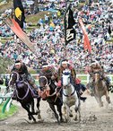 島根県隠岐の島町下西の玉若酢命神社で5日、島後三大祭りの一つで、県指定無形民俗文化財「御霊会(ごれえ)風流(ふりゅう)」が営まれた。町内8地区から集まった神馬が馬付き6人と拝殿を目指して疾走し、観客を沸かせた。
