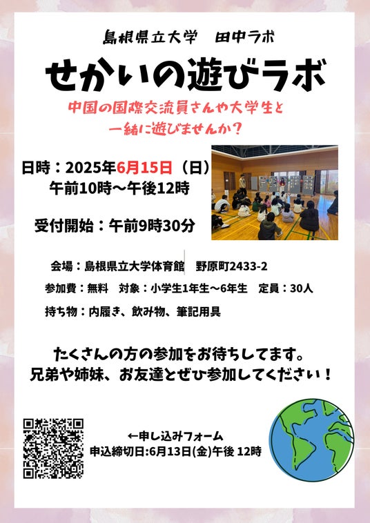 今回は、中国出身の浜田市国際交流員 王哲さんをお招きし、中国にまつわる話を聞いたり、中国のゲーム等を体験したりします。みんなで一緒に遊びませんか? たくさんの方の参加をお待ちしてます。お気軽にご参加ください!