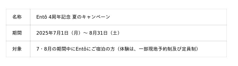 島根県隠岐諸島・海士町の滞在型ジオホテル「Entô(エントウ)」は、2025年7月に4周年を迎えるにあたり、島の自然と文化、人に出会う記念キャンペーンを7~8月に実施いたします。島の人が“火守り”となり語りを交わす「焚き火の時間」や、夜明け前の海へ出航する「3setサンライズクルーズ」など、ここでしか体験できない朝と夜をテーマにした特別な時間を提供します。