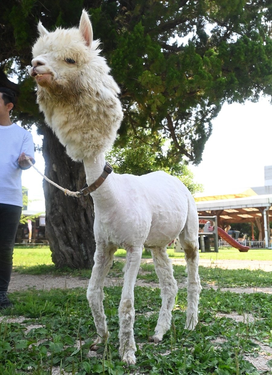 南米原産でラクダ科の動物、アルパカの毛刈りが19日、米子市岡成の大山トム・ソーヤ牧場であった。顔周りの毛だけを残したトイプードル風スタイルに変身し、夏に備えた。