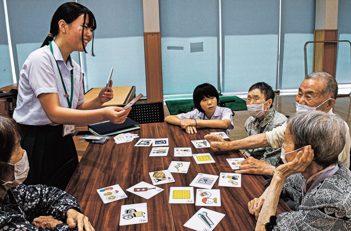 福祉地域への理解を深め、実践的な態度を育もうと、総合的な学習の福祉人権学習として取り組んだ。 三つのヒントを読み上げ、答えのイラストが描かれたカードをかるたのように取り合う「スリーヒントクイズ」や、手製の自己紹介カードで高齢者11人と笑顔で会話を楽しんだ。自己紹介カードは高齢者にも見やすいよう文字の大きさや色、イラストの配置などを工夫した。