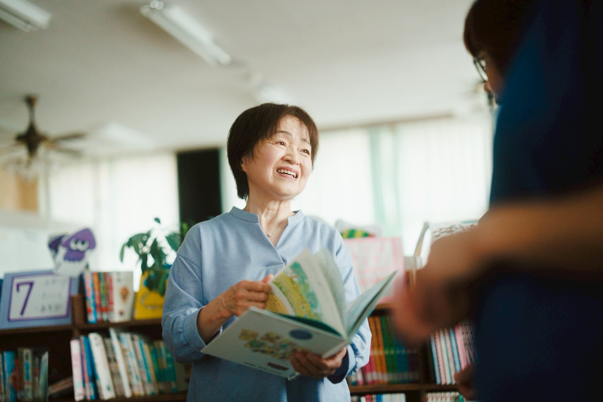 教室では、にこやかな顔で子どもたちに語り掛けるよう心がけています。絵本を手にすると、すっと背筋が伸び、自分自身も物語に入り込みます。