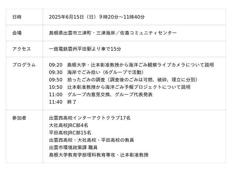 2025年6月15日(日)9時20分~11時40分開催場所:島根県出雲市三津町・三津海岸/佐香コミュニティセンター