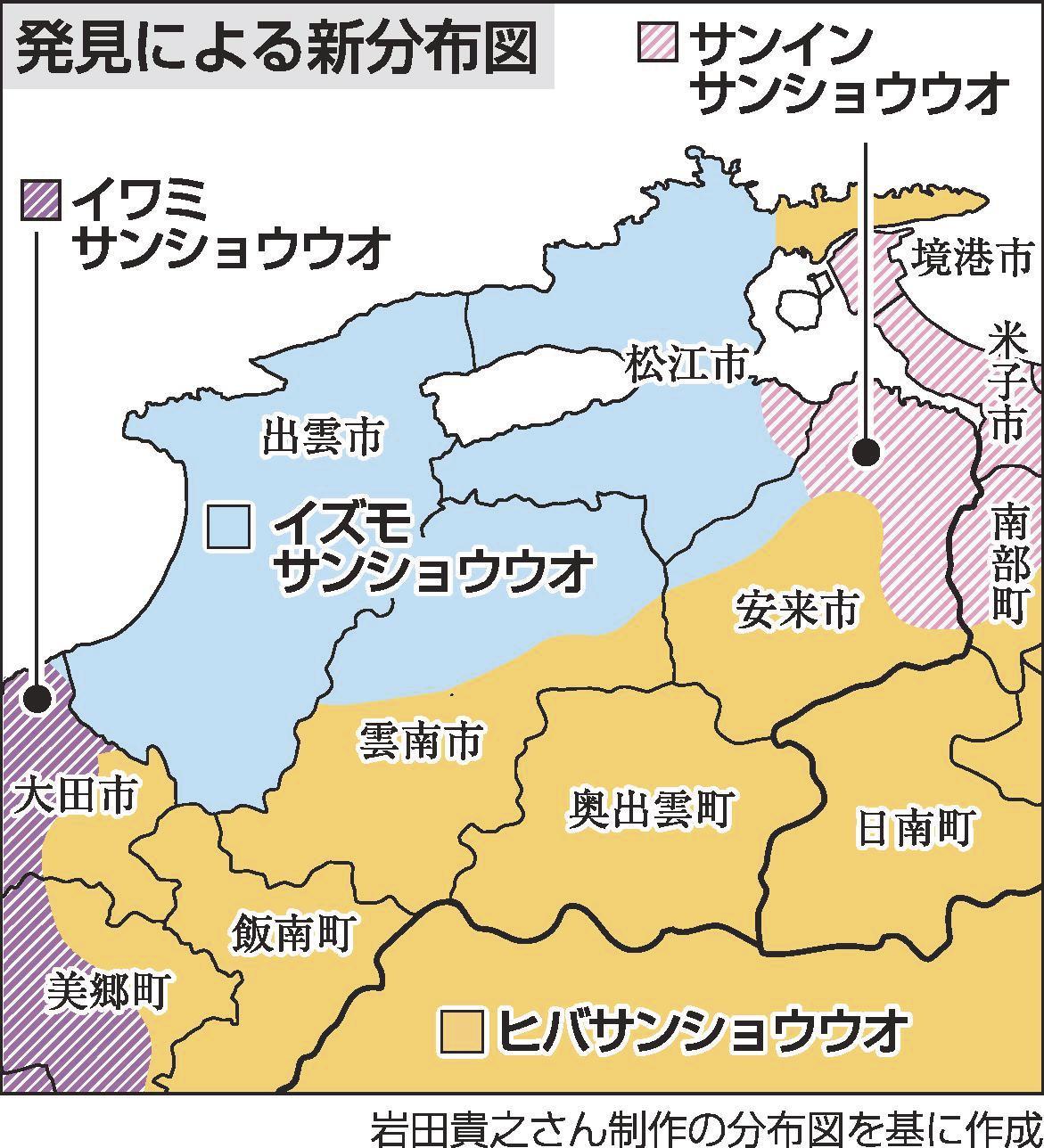 サンイン、ヒバ、イワミのいずれとも遺伝子情報が異なる個体群が、松江市の大部分、出雲市、同市境付近の大田市のごく一部、雲南市北部、安来市の一部に生息していることを突き止めた。岩田さんは「先行研究では不明だったイワミやサンインとの分布境界をほぼ特定できた」と話す。