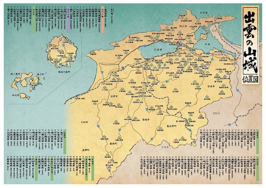 戦国期、出雲には約500の山城が築かれたとされます。その中から主要な127城を厳選し、地図上にプロットしたビジュアルポスター。登城計画の立案はもちろん、インテリアとしても映える一枚です。・名称:出雲の山城位置図 ポスター