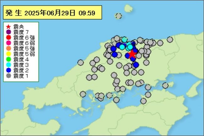 29日午前9時59分ごろ、鳥取県と島根県で震度3の地震があった。気象庁によると、震源地は島根県東部で、震源の深さは約10キロ。地震の規模はマグニチュード(M)4・0と推定される。各地の震度は次の通り。