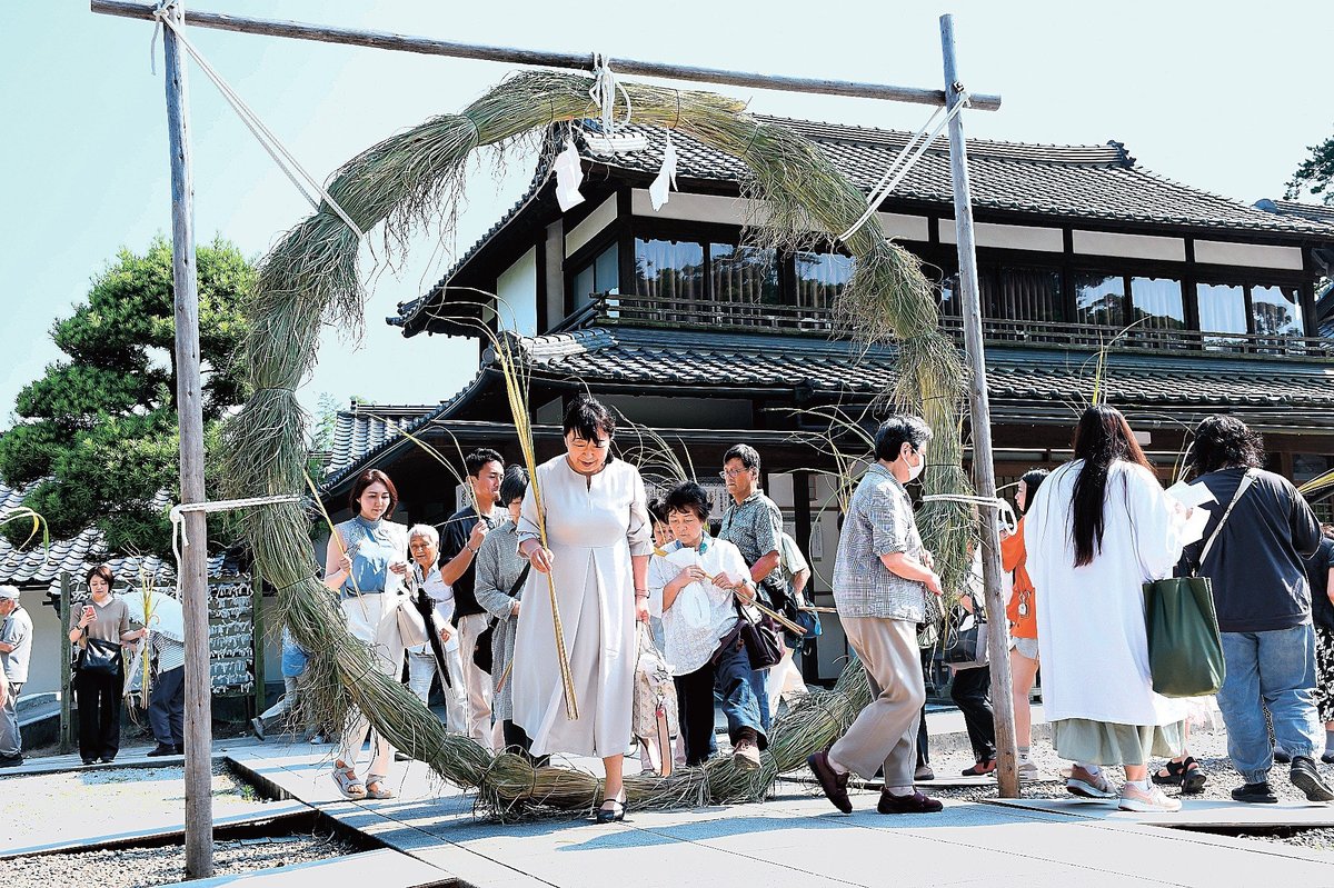 神事の後は神殿前に設置された直径3メートルの茅の輪に向かい、神職が「はらいたまえ、清めたまえ」と唱えながら8の字を描くように3回くぐり、参拝者も続いた。雲南市三刀屋町から夫婦で訪れた坂元均行(まさゆき)さん(67)は「体調に気を付けて過ごし、来年もぜひ来たい」と話した。
