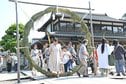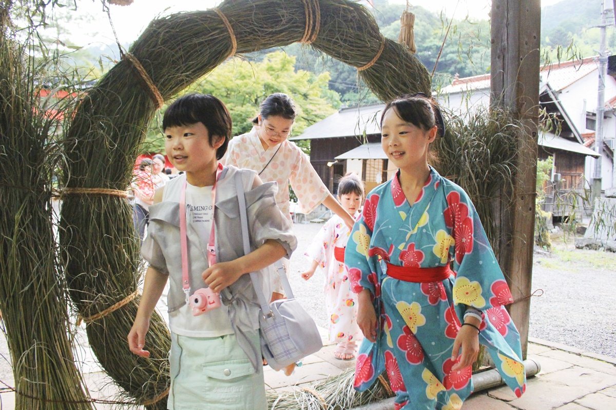島根県津和野町後田の弥栄神社(桑原秀幸宮司)で6月30日、夏の始まりを告げる「輪くぐり神事」があり、浴衣姿の参拝者たちが、大きな茅(ち)の輪をくぐり、無病息災を祈った。