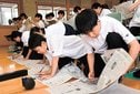 生徒は山陰中央新報社NIE担当の説明を聞きながら当日の紙面に目を通し、見出し、リード(第1段落)、本文(2段落以降)に印を付け、それぞれの役割、結論を先に書く新聞記事の構造を理解した。