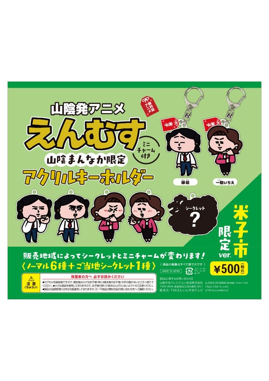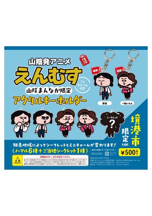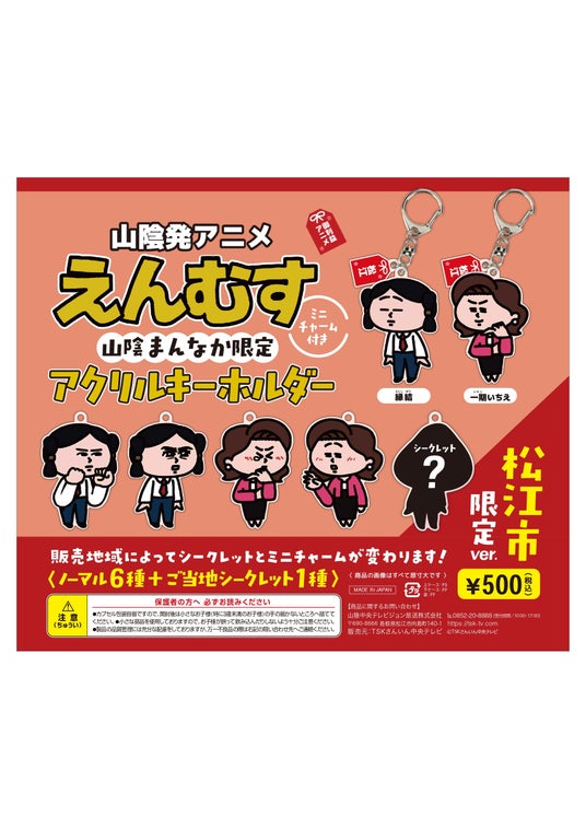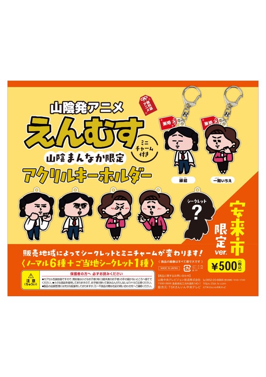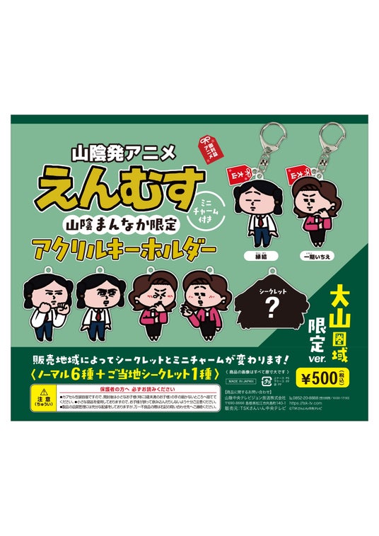 【概要】山陰発YouTubeアニメ「えんむす」との初コラボ!中海・宍道湖・大山圏域の6施設に限定カプセルトイを設置。2カ所以上でカプセルトイを回した方は、カプセル内のQRコードから応募でき、抽選で10名様に「えんむす」オリジナルグッズが当たります。