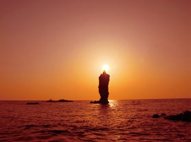 ローソク島遊覧船(隠岐の島町)夕陽が海上の奇岩「ローソク島」の先端に重なる瞬間、まるで巨大なろうそくに灯がともったような神秘的な光景に。遊覧船でしか見られない絶景です。