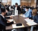 松江市浜乃木8丁目、松江商業高校で8日、商業科の3年生104人がビジネス電話の応対研修をした。りそな銀行島根カスタマーセンター(出雲市駅南町2丁目)が20周年事業の一環として実施し、生徒は販売実習のイベントや就職して必要になる電話応対を学んだ。