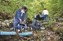 先輩から引き継いだ2年生は寺西さんと一緒に、幅約5メートルのワサビ田に生い茂った草を抜き、石に付着したコケをそぎ落とした。協力するワサビ農家の安藤達夫さん(62)の指導を受け、くわを使い水の流れをつくる溝を掘り、整備した約20平方メートルの一画に約30本の苗を植えた。約2年かけて根茎が15~20センチに成長し、収穫できるという。